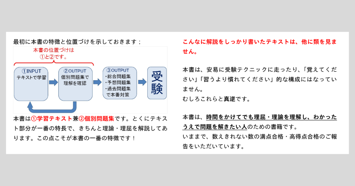 本試験で問われる大問のパターンをすべて網羅できているので、問題集を何周もやりこむだけで、合格点に到達できます。