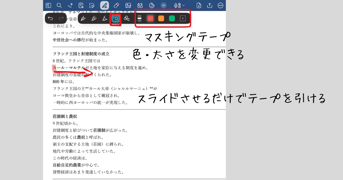 GoodNotesのマスキングテープ機能は、文字や手書きした部分をテープで隠しながら、暗記をサポートしてくれる便利な機能です。