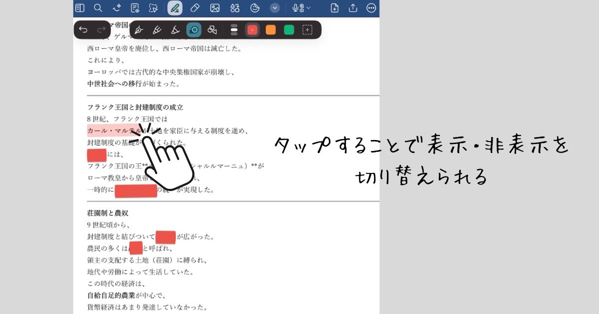 GoodNotesには、最初から暗記に向いた「マスキングテープ機能」が用意されており、これを使うだけで、赤シート特有の手間や使いにくさを避けることができます。